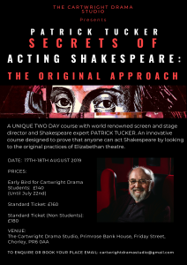 After the success of our last course with world renowned screen and stage director Patrick Tucker, he will be back with an innovative TWO DAY course designed to prove that anyone can act Shakespeare by looking to the original practices of Elizabeth theatre!